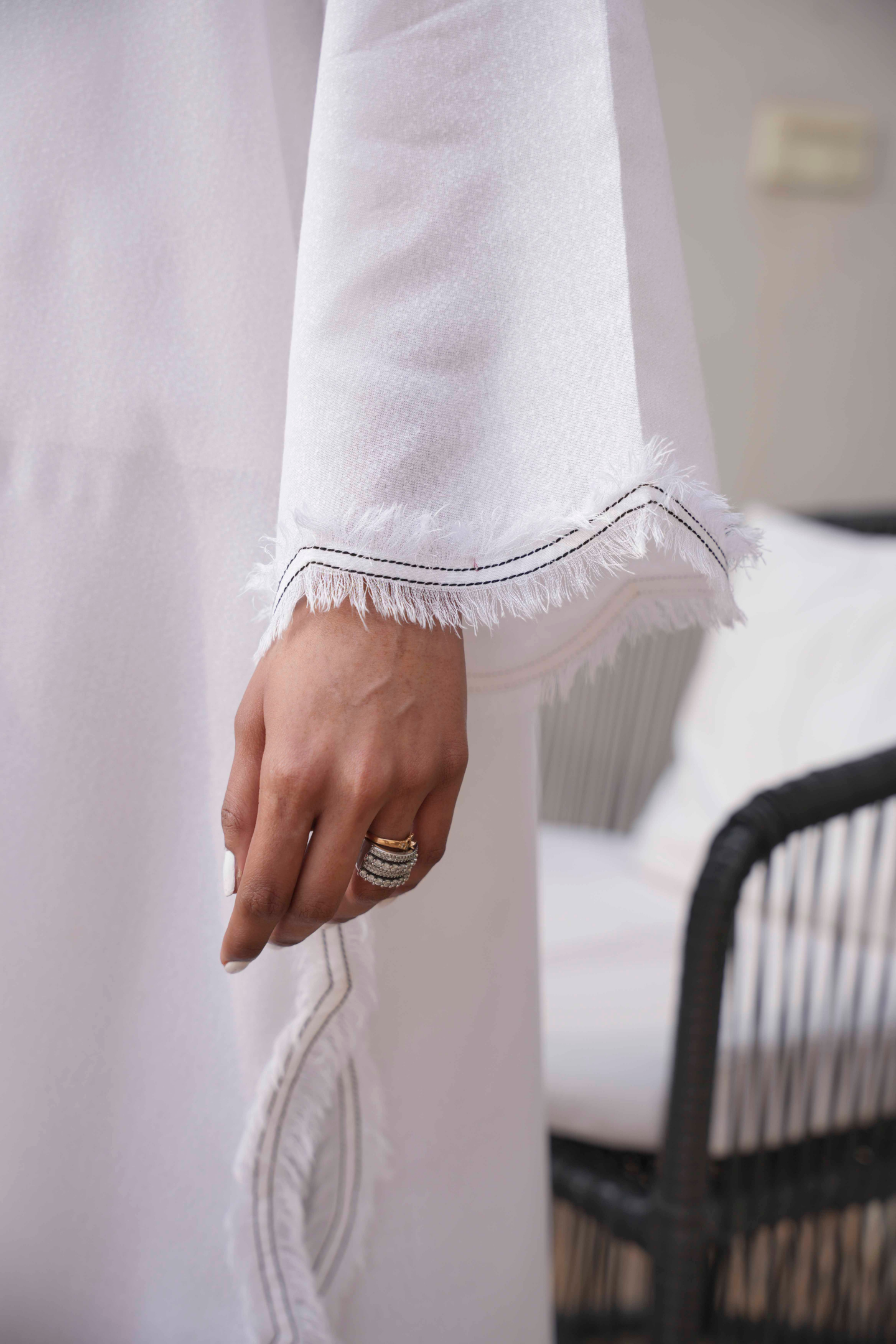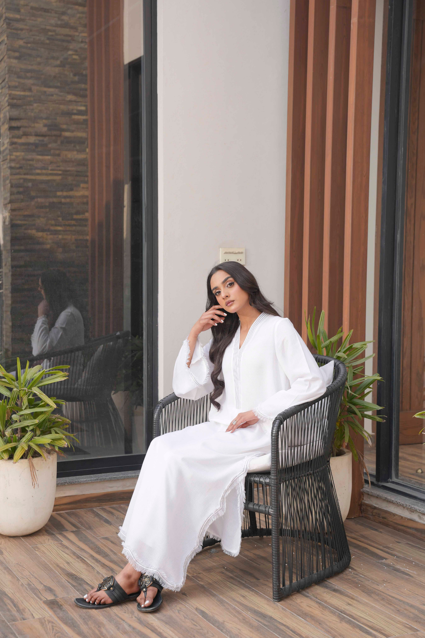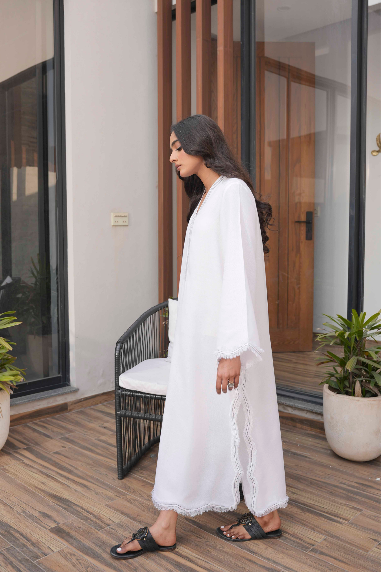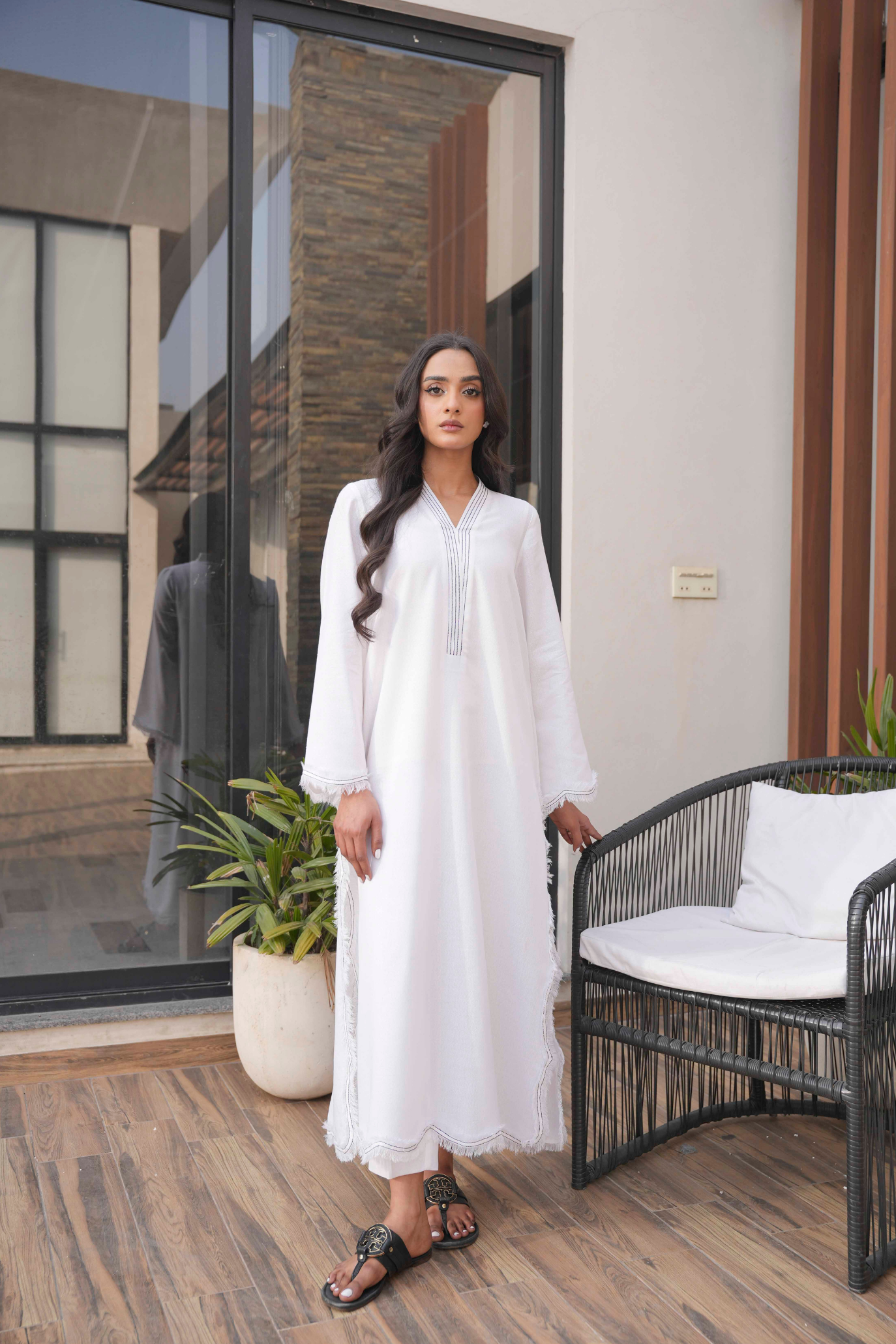 Crafted from lightweight Karandi fabric, this dress offers a soft, breathable feel with a graceful drape. The design is finished with delicate scalloped detailing and a fringed daman, adding subtle texture and an elegant, refined touch.