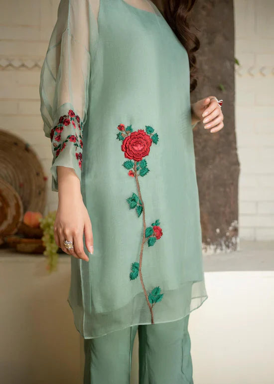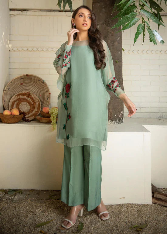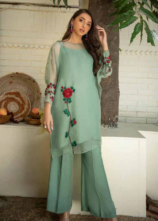 Description: This mint green organza bat-sleeved shirt is beautifully adorned with 3D motif and beautifully detailed cuffed sleeves, comes with matching slip. Paired with matching front pleated bootcut pants.