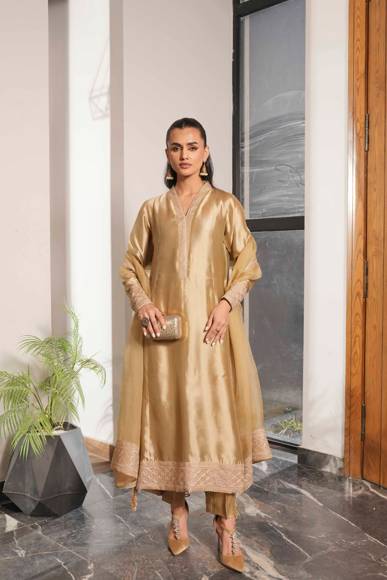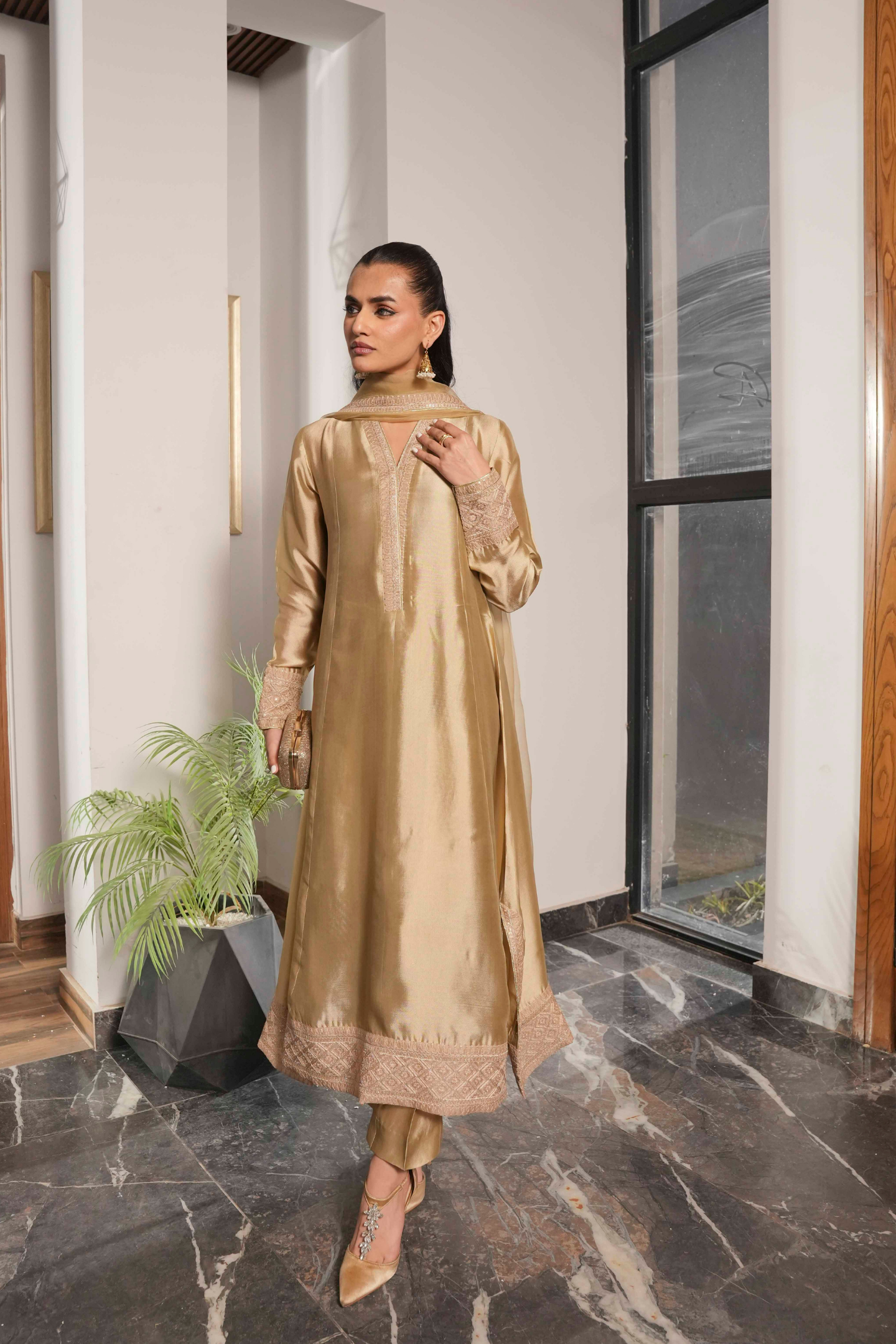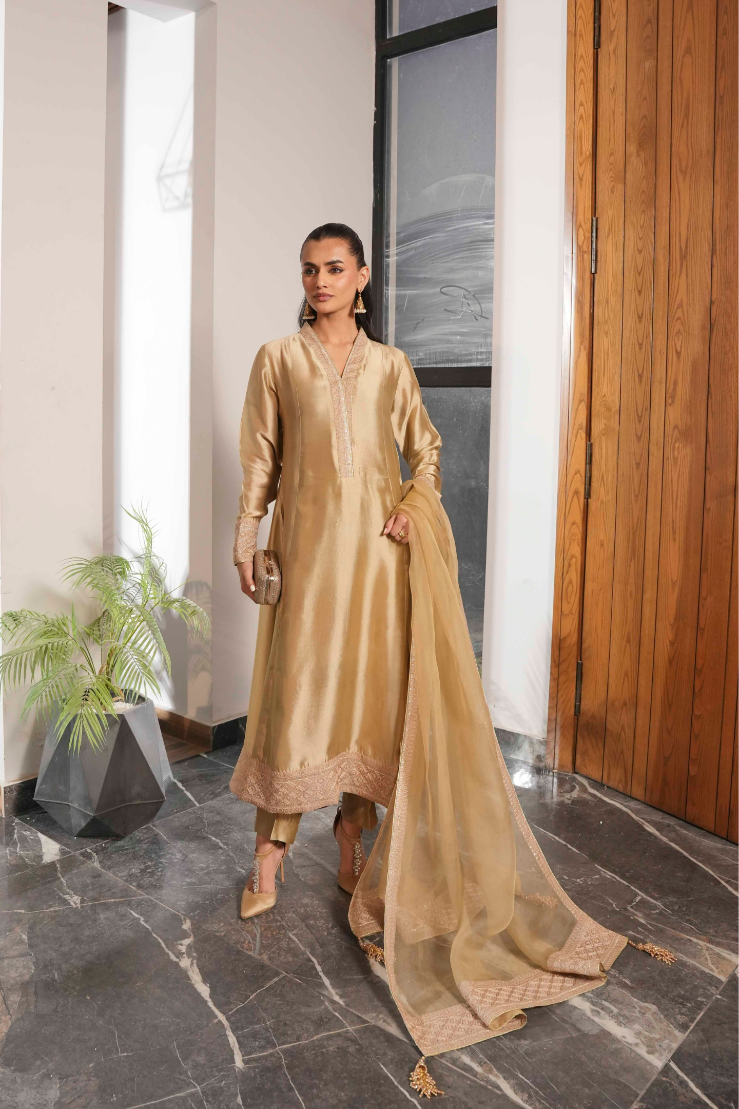 A study in refined elegance, this piece showcases intricate Noorey embroidery with subtle gold accents. The silhouette flows gracefully, creating a classic, enduring charm that transcends trends—perfect for festive and special occasions.