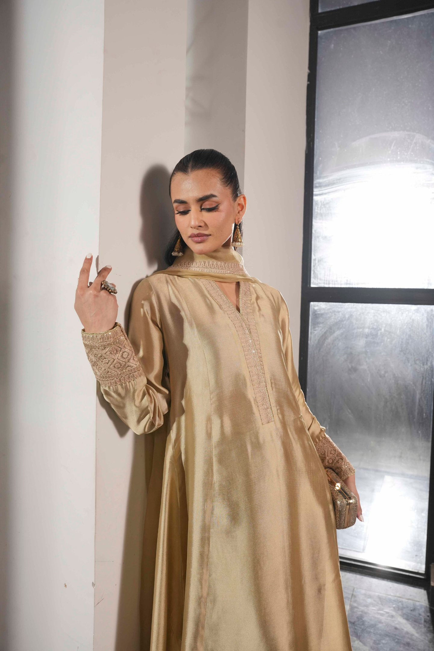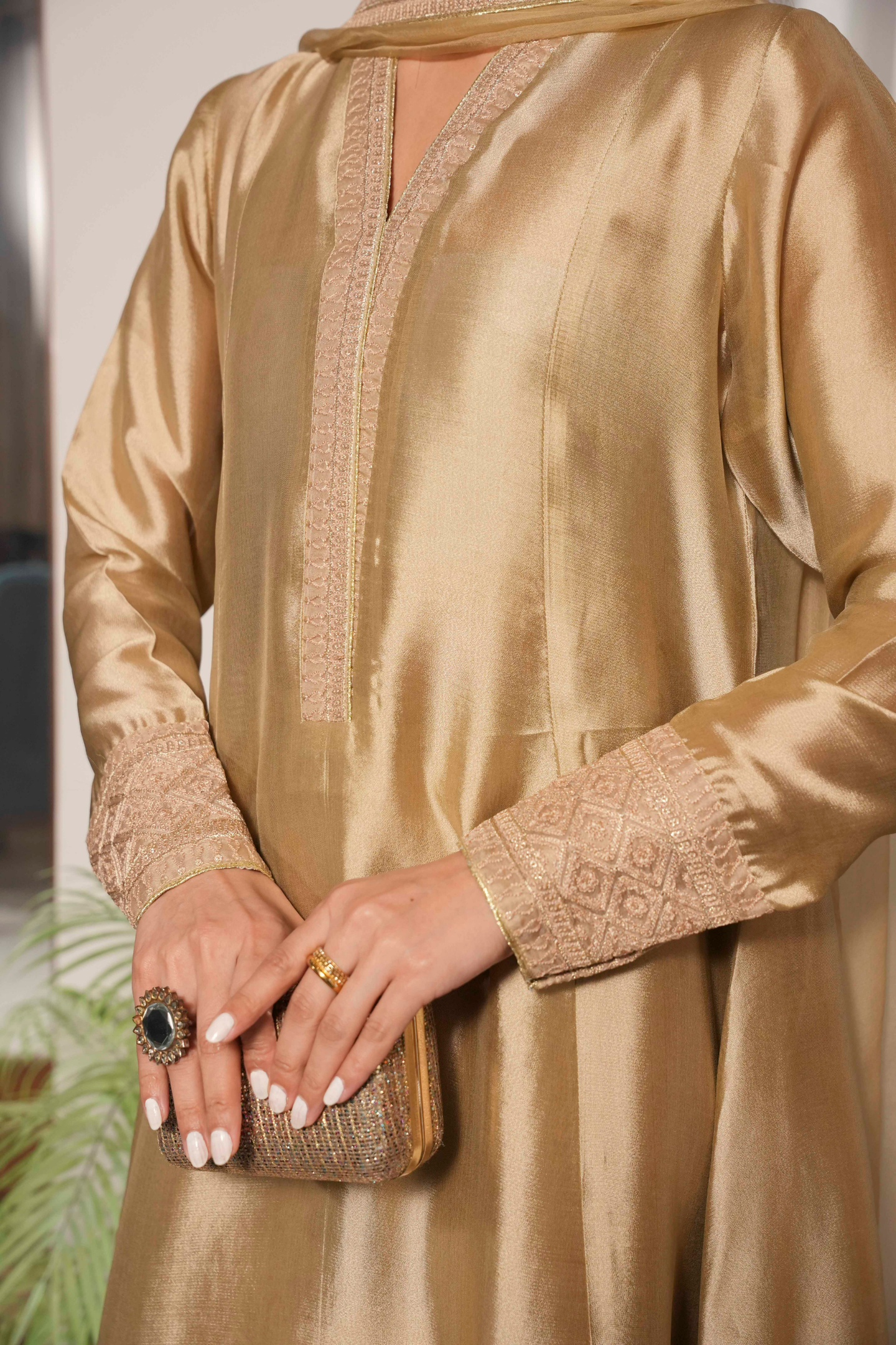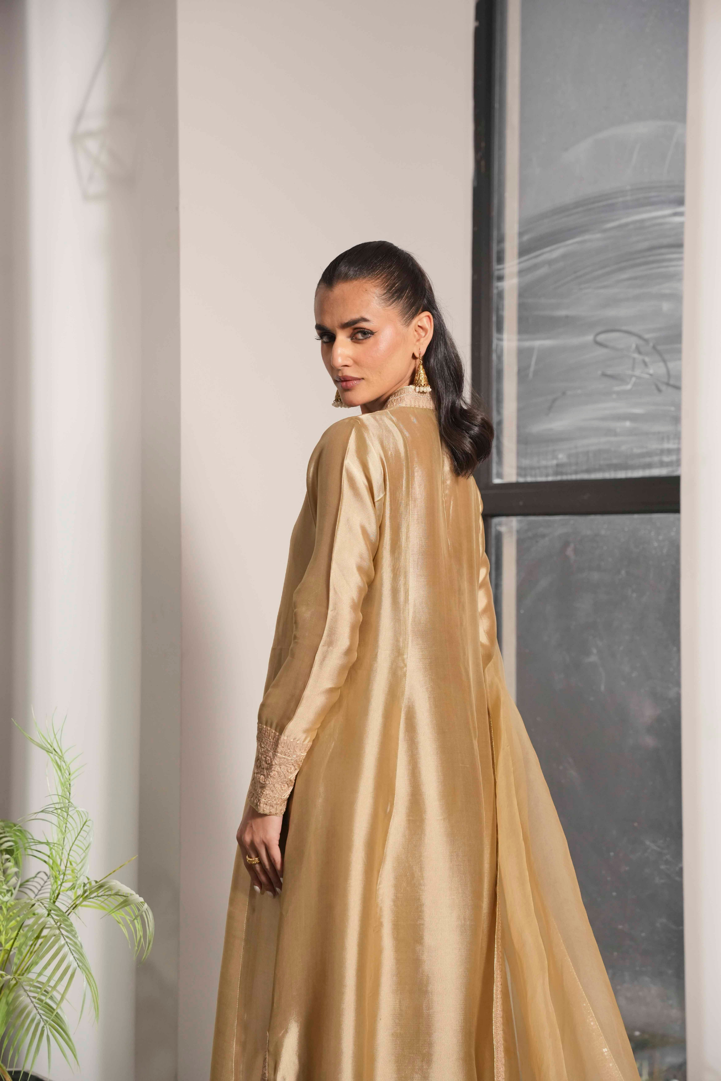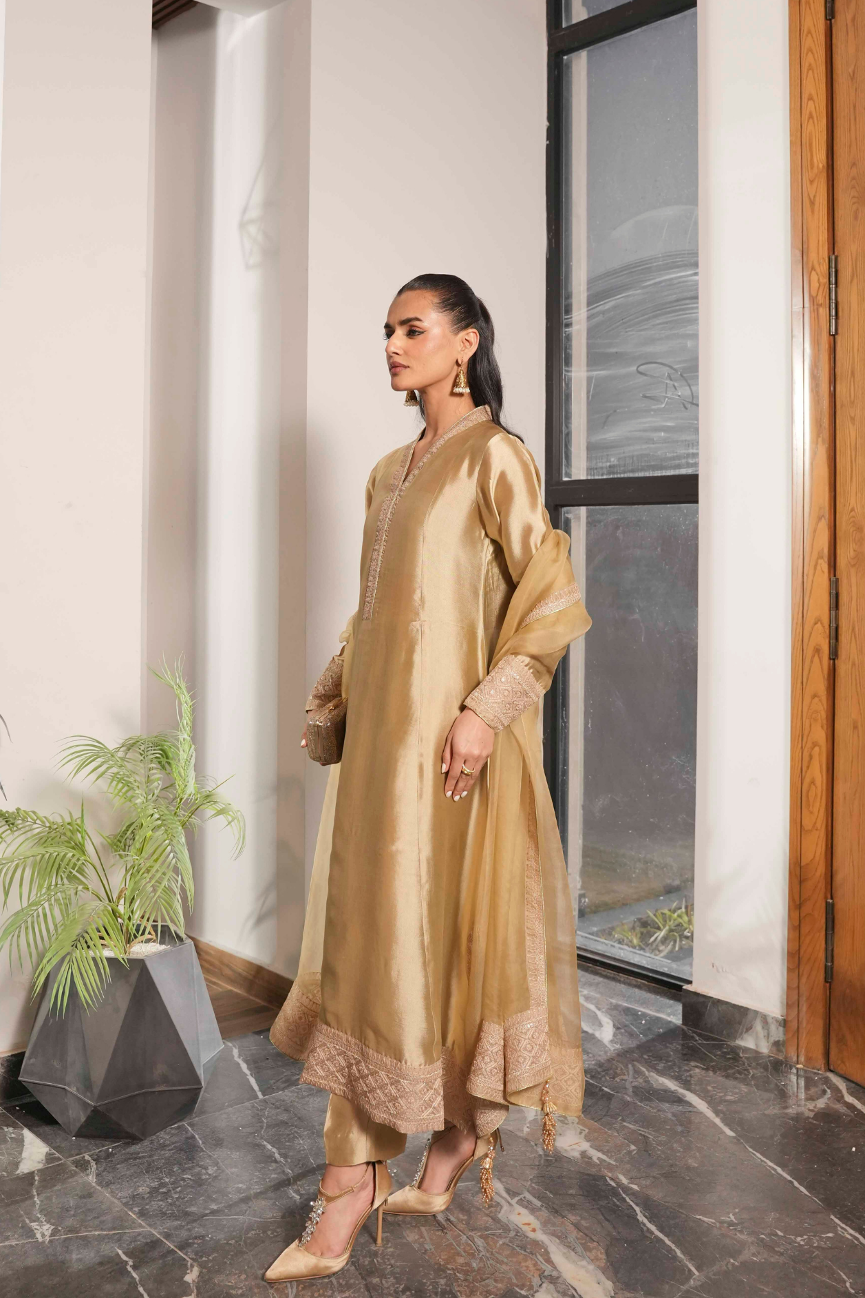 A study in refined elegance, this piece showcases intricate Noorey embroidery with subtle gold accents. The silhouette flows gracefully, creating a classic, enduring charm that transcends trends—perfect for festive and special occasions.