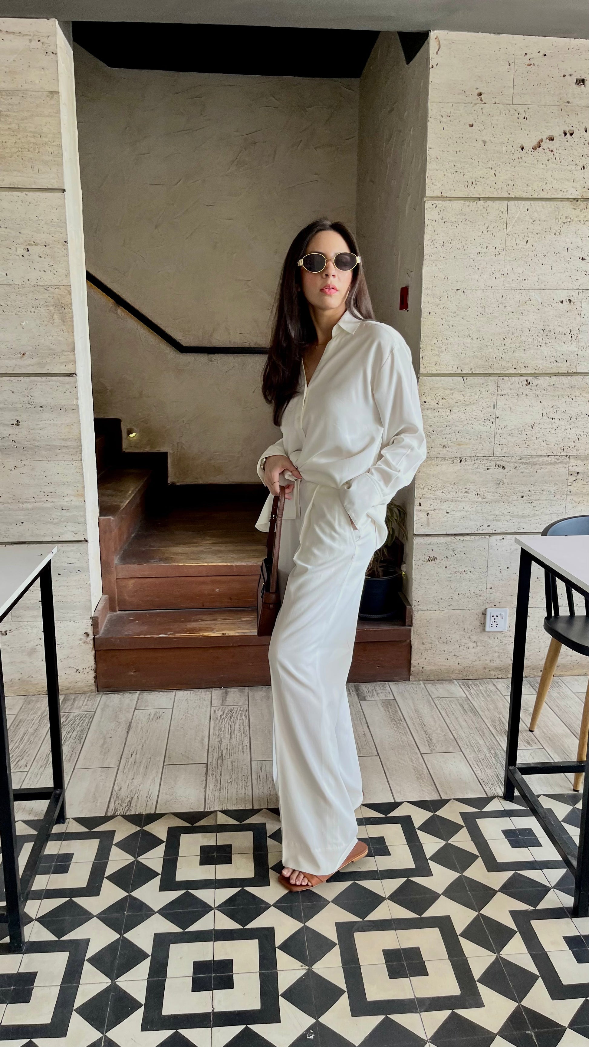 A classic button down shirt with pleated formal pants.