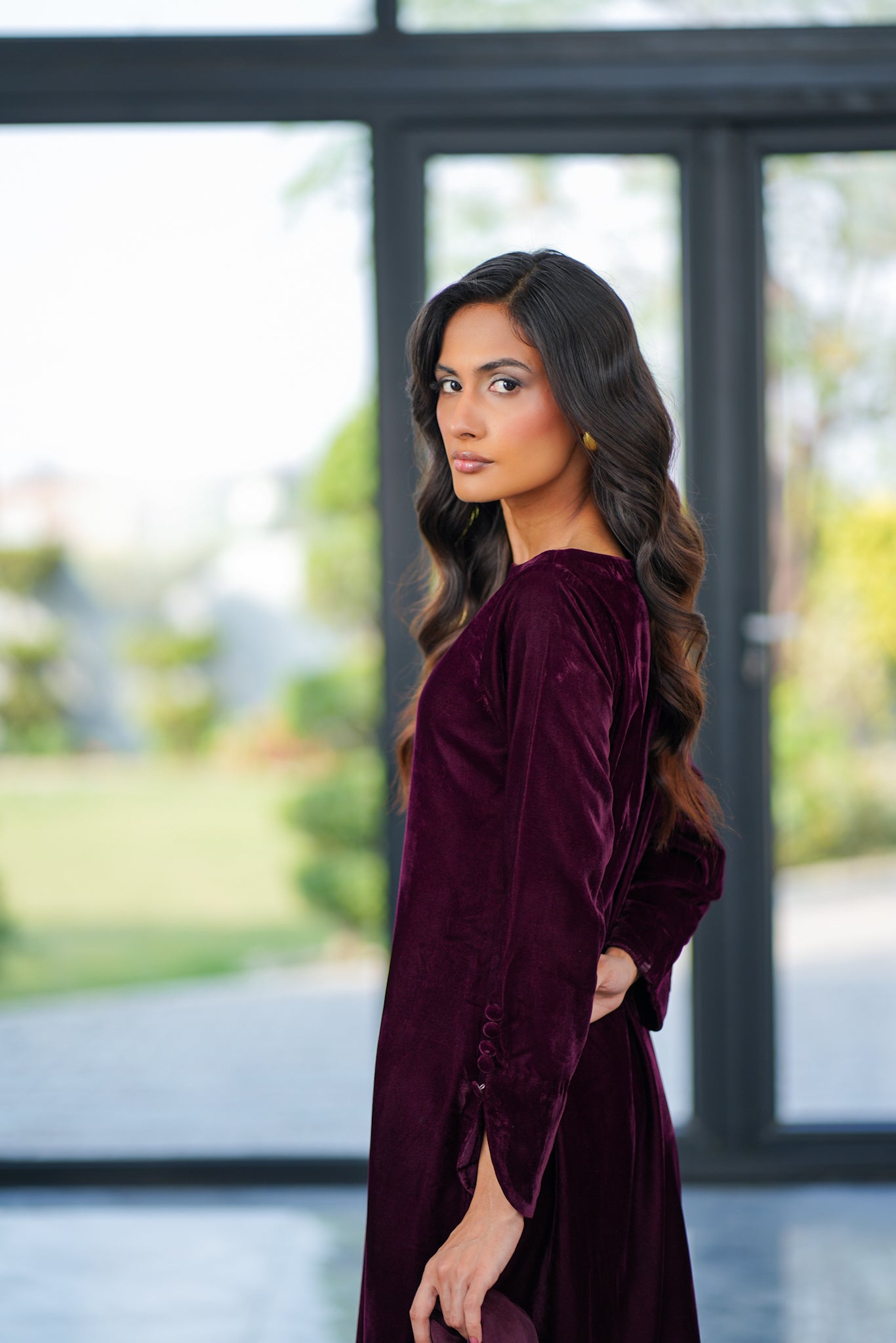 Step into timeless elegance with this Plum Velvet Kurta Set, designed for refined sophistication and comfort. Crafted from rich velvet, this luxurious ensemble features a sleek straight-cut kurta with elegant sleeve detailing and matching trousers adorned with delicate finishing at the hem.